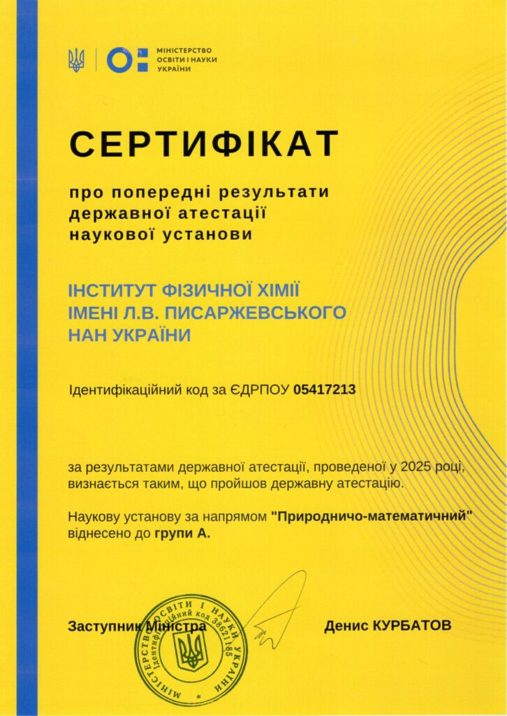 За результатами Державної атестації МОН України Інститут фізичної хімії ім. Л. В. Писаржевського НАН України набрав максимальні 100 балів й отримав категорію А